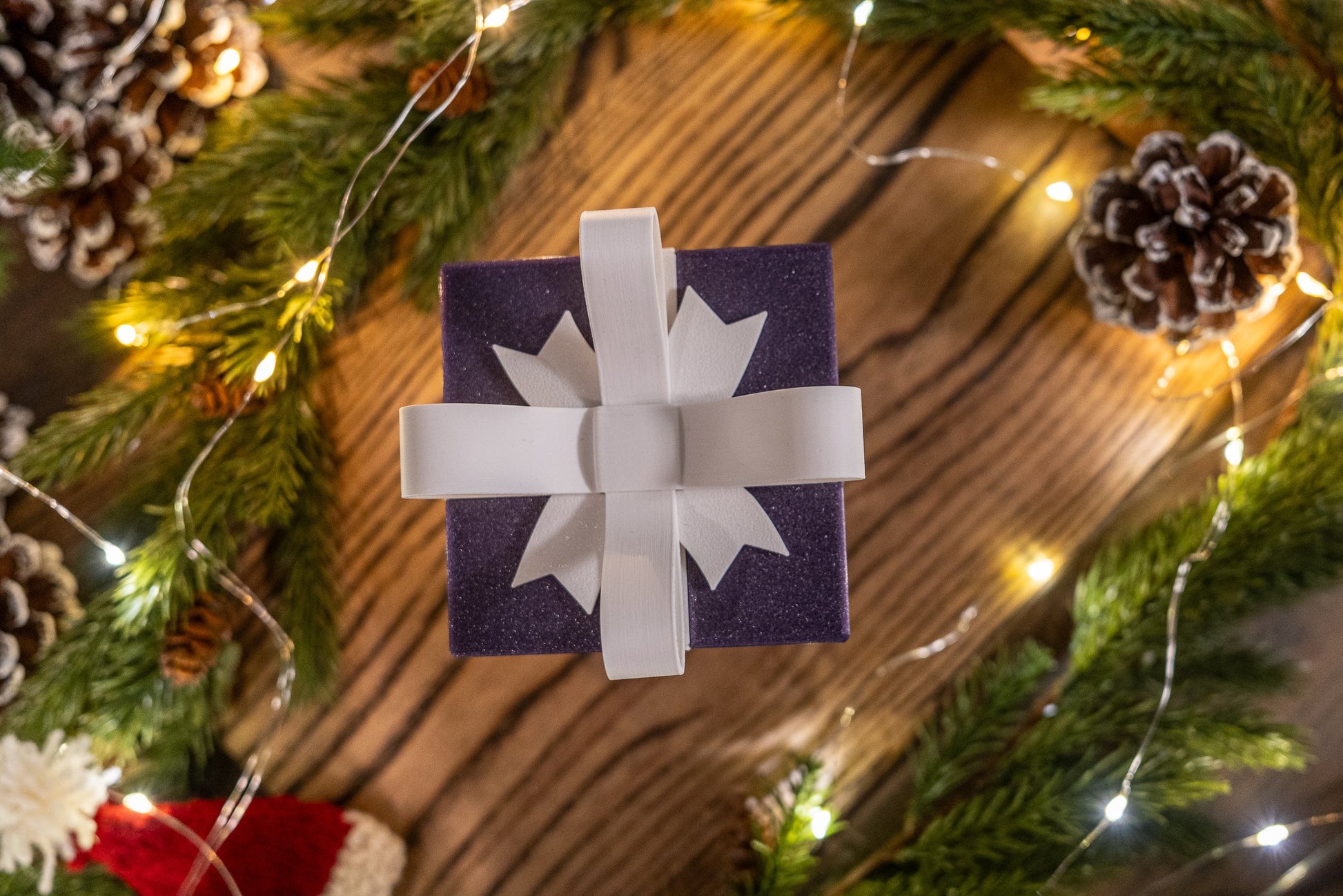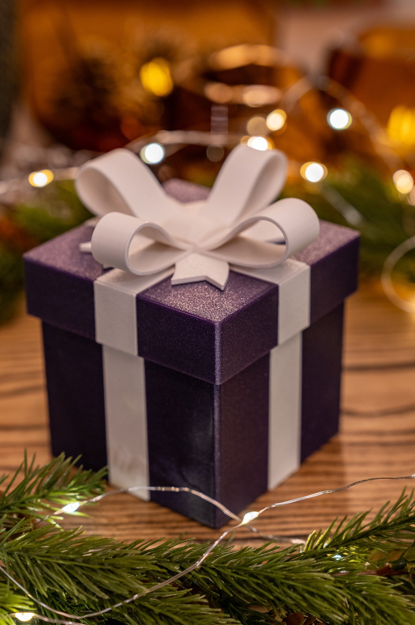 Boksen er laget i lilla PLA med diskret glittereffekt og rene, hvite detaljer som gir et moderne og stilrent uttrykk. Den smarte låsemekanismen gjør åpningen til et lite øyeblikk i seg selv – perfekt når du vil gjøre en liten gave mer spesiell.